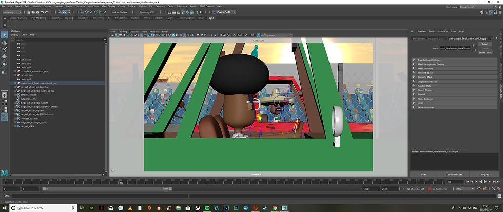 Animating the project was a lot of fun, I the first thing I done was much like in the 3D animatic was to animate the cars moving from start to finish which was in effect sort of like blocking but much easier. It helped speed up this process as I already worked some of the timing issues that needed to be addressed with the animatic. Once this was done I started adding animation to the suspensions to give the cars their sense of weight. This was an area I wanted to reflect real cars so I tried to make them behave the same way a real life car would with a bit more emphasis. The scene with the suspension is mainly where you notice the most of movement until its rusty hydraulics malfunction.